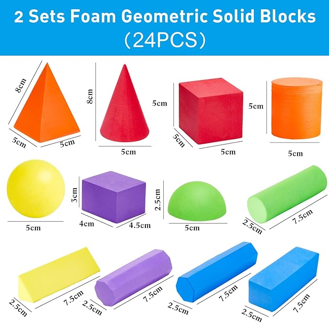 - Foam Building Blocks: you will get a total of 24 pieces of solid foam building blocks in 12 different shapes of building blocks, including triangular prism, cone, cube, cylinder, sphere, cuboid, hemisphere, triangular cone, octagonal prism, hexagonal prism, etc.; Most of them are around 2 inches; Each shape has 2 building blocks; The quantity and shape are sufficient to meet children's use and learning needs