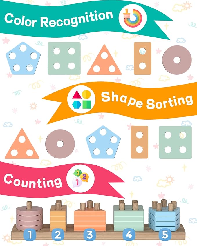 - 【Safe Design for Little Ones】This toddler learning toys include high-quality, chunky wooden pieces to ensure tiny hands easily grasp the pieces and complete the stacking puzzles. The edges of montessori sorting toy are smooth and the pegs are sturdy.These blocks are not only covered with smooth non-toxic paint, as safe as food,but odorless and anti-fade, which keeps our 1 2 3 years old boys and girls play with safely. There’s no doubt that little babies will enjoy playing with such toddler toys.