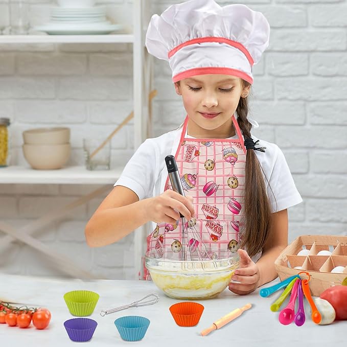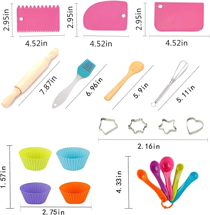- Complete & Colorful, 24-piece Kids Cooking and Baking Kit is Designed For Kids - It includes 1 x chef hat, 1 x apron, 1 x oven mitts, 1 x hot pad, 1 x wooden spoon, 1 x rolling pin, 1 x hand mixer, 1 x Silicone Brush, 4 x cookie mold, 4 x cupcake molds, scraper*3, measuring spoon*5.