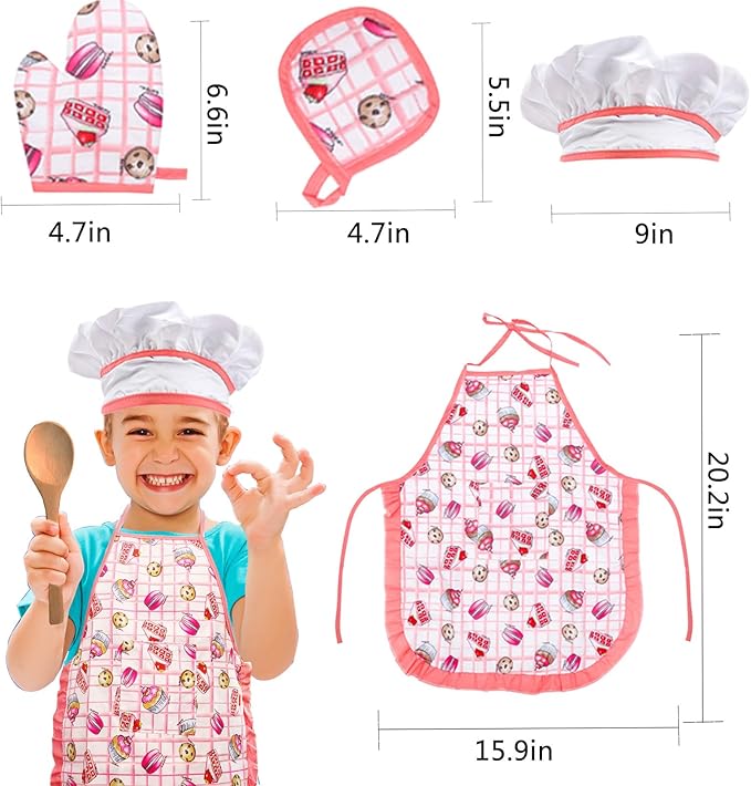 - Best Gift - Great Kids Apron set for girls! This set for Christmas gifts, birthday gifts, easter, school activities, Halloween gift, etc. It is such a portable kids cooking set that kids can cooking at home with parents.
