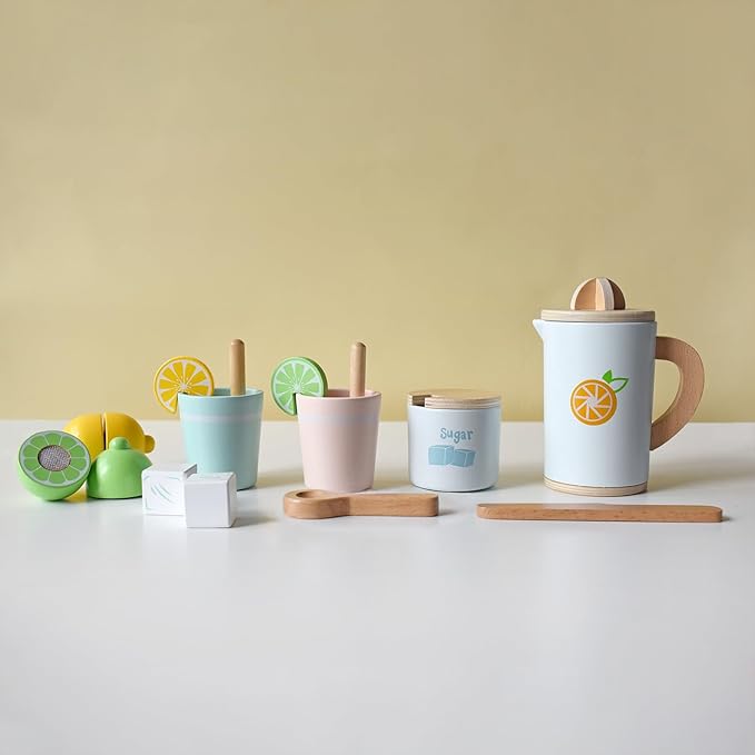 - DELUEX WOODEN TOYS - This toy mixer set include lemonade toy drink jug,chalkboard, cups,play food lemons with slices,ice cubes and more kitchen play toys.Inspiring their creativity and imagination play.