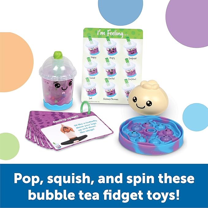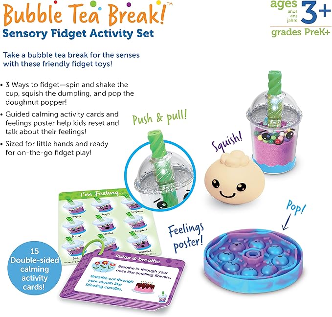 - Sweet Sensory Fidget Toy Fun: Pop, squish, and spin—kids discover fun new ways to fidget with this set of sensory fidget toys inspired by sweet bubble tea treats!
