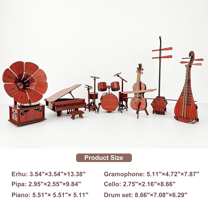 • 【Engaging Music Instrument Set】 Experience the joy of assembling these elaborate wooden 3D puzzles. This set includes six musical instruments: a piano, gramophone, drum kit, cello, erhu, and pipa. Each puzzle piece is crafted with high-quality wood and exquisite craftsmanship, not easily breakable, ensuring durability and a satisfying puzzle experience. Add joy and challenge to your life