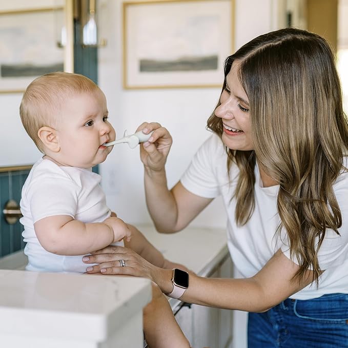 - CONVENIENT COUNTERTOP STORAGE. The elephant ears let baby set the brush down without surface contact or the stable base lets you securely store it upright.