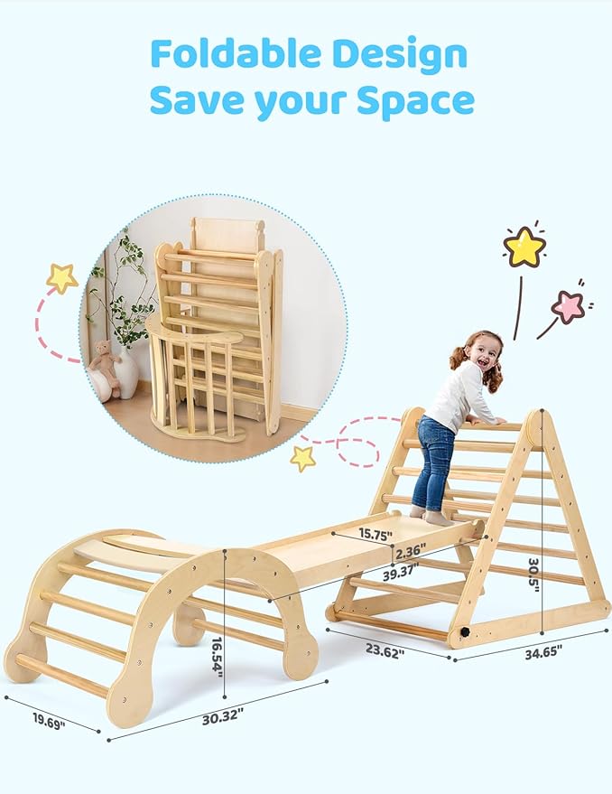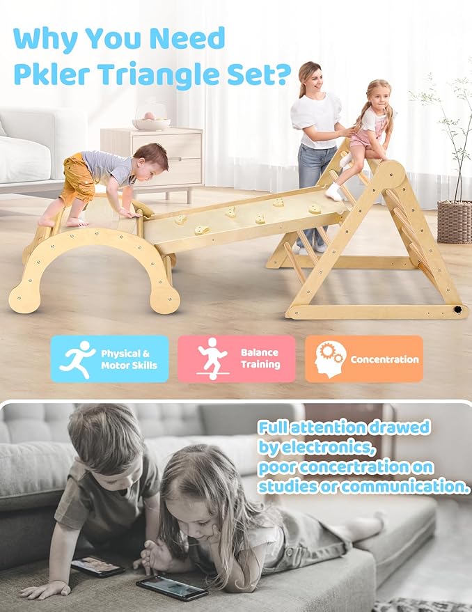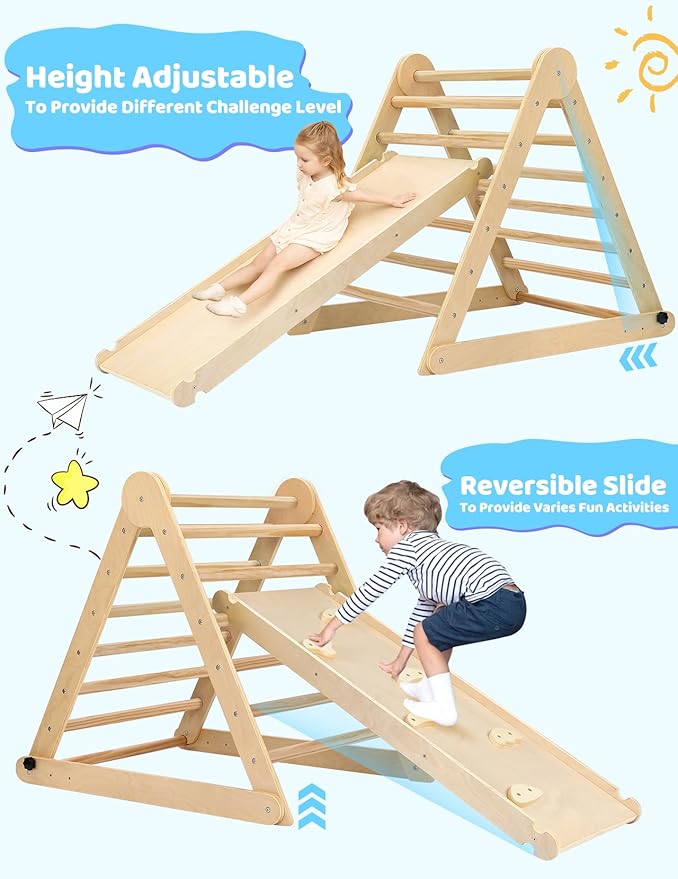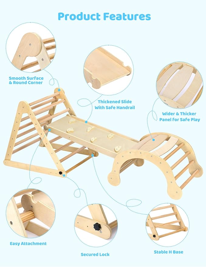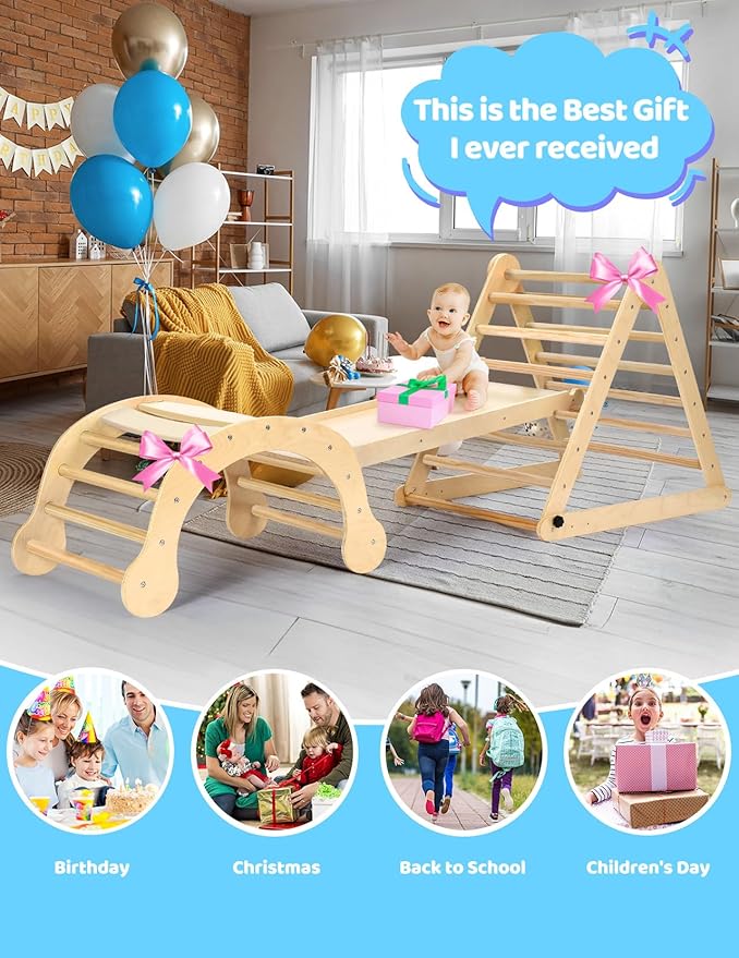 - 【Great Montessori Climbing Set for Kids Early Development】The Pikler triangle climbing set is an excellent Montessori tool for early education, making it a perfect gift as children grow. It encourages kids to explore independently, push their limits, and support their physical and cognitive growth. With this innovative and practical toddler playground, children can acquire essential life skills, boost their self-esteem, and experience healthy development through fun play