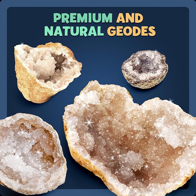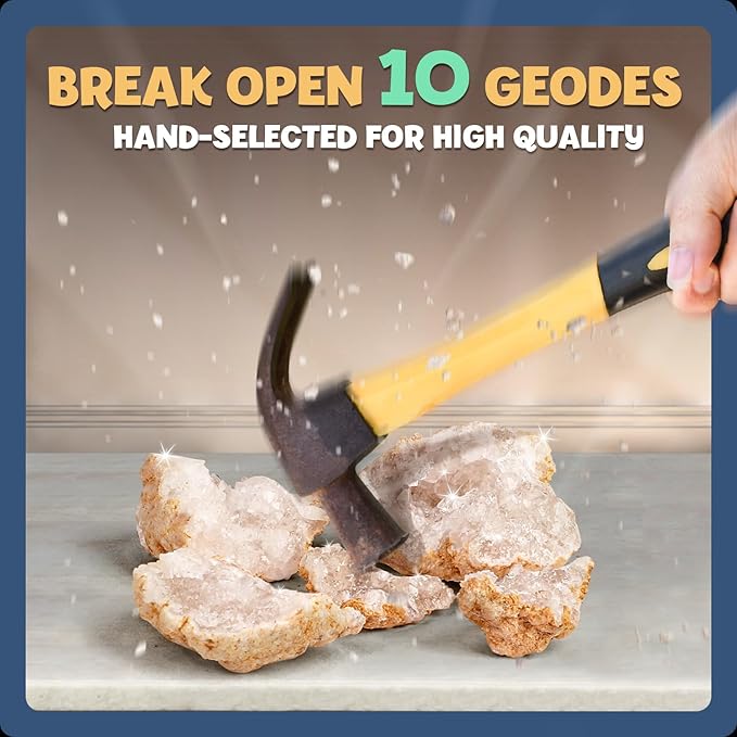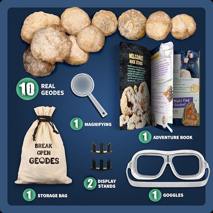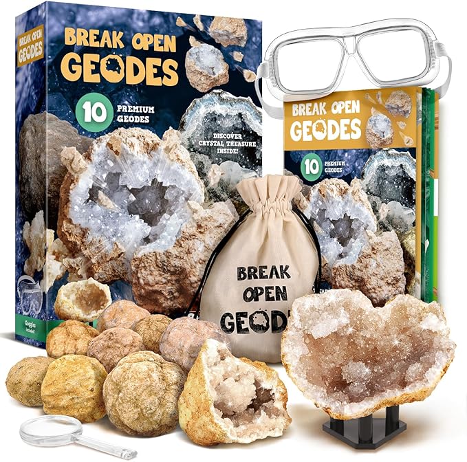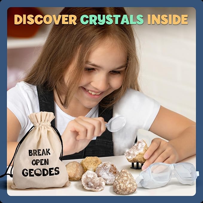 - XXtoys Crystal Geodes: Break open 10 natural geodes and discover with hidden crystals inside! Come with goggles to protect your eyes from rock dust and splinters, a magnifying to study closely, 2 display stands to display your real geode specimen and a learning book to learn and discover!