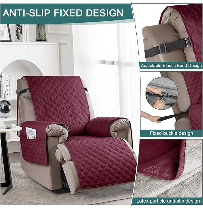 Ruaozz 100% Waterproof Recliner Chair Cover Non-Slip Oversized Reclining Cover for Large Recliner Chair Washable Chair Seat Cover with Elastic Straps for Kids, Dogs, Pets (Wine, 28'')