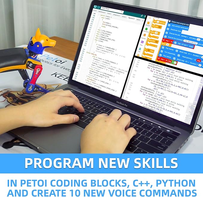 - Coding robot dog: create new behaviors with block-based coding/Python/C++ and visually design new robot skills. Code Bittle X to perceive surroundings & navigate with an optional camera or compatible Arduino IoT sensors.
