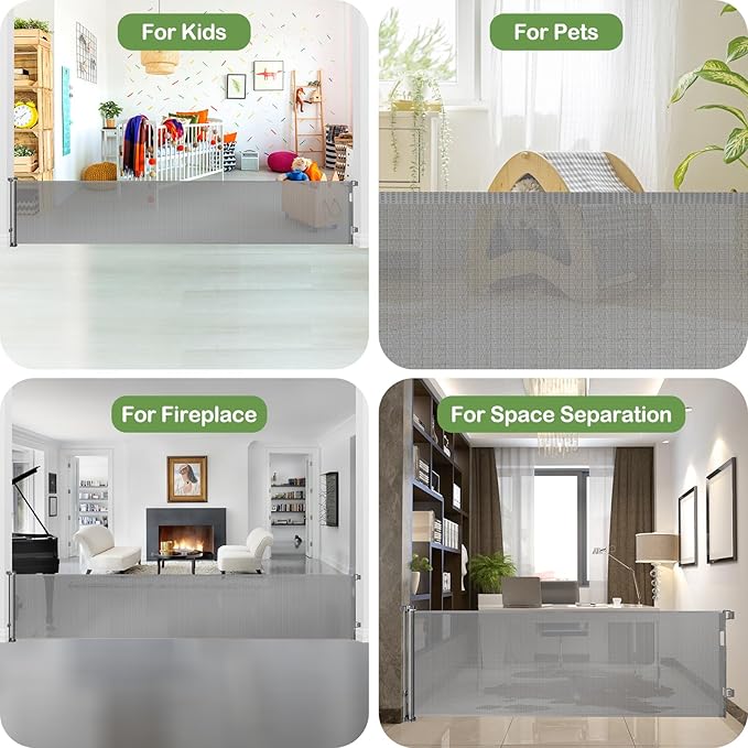 - [Versatile Security Barrier] - KISKIZ retractable baby gate is a versatile home security solution that can be used as a baby safety gate, pet barrier, or to separate different areas of your home or create a designated baby fence play area. Perfect for homes with large openings or open floor plans.