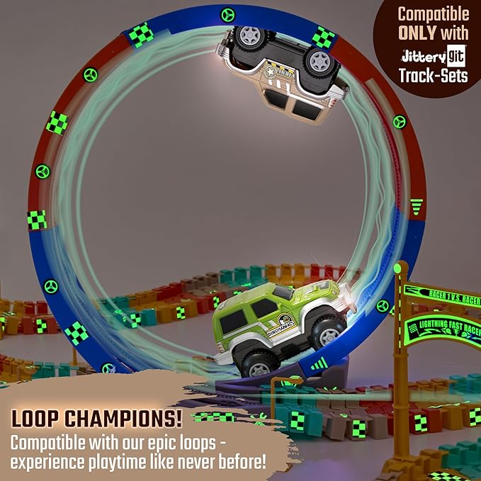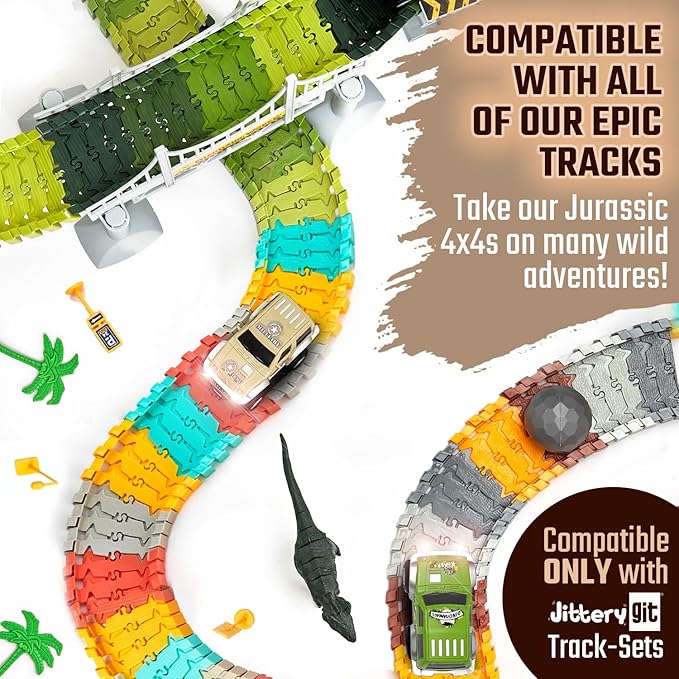 - 【Ready for Any Racetrack 】- These awesome dinosaur jeeps are ready to race! Completely compatible with all of our racetrack sets, Dinosaur racetrack, Flashtrack and Construktor! They also work perfectly on major themed cars race track!