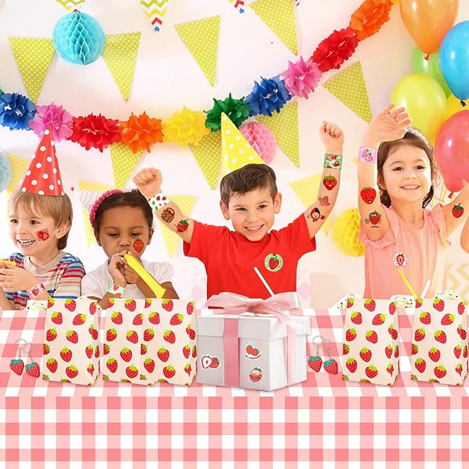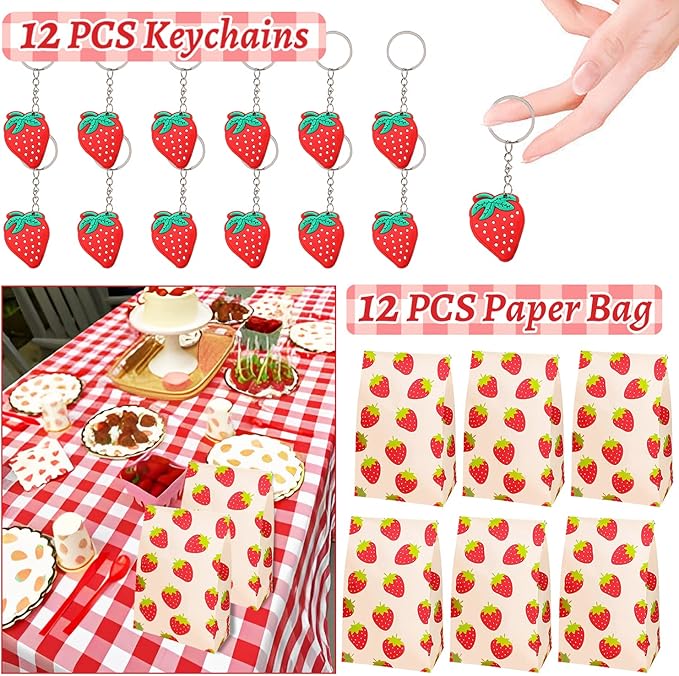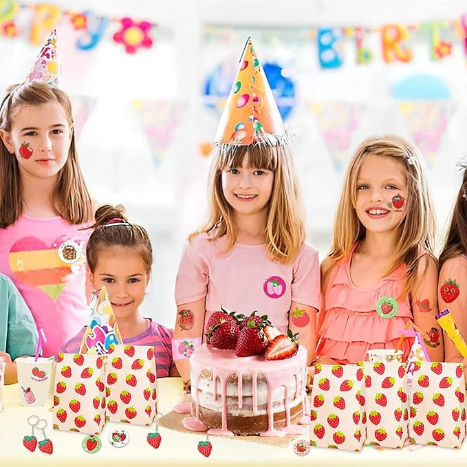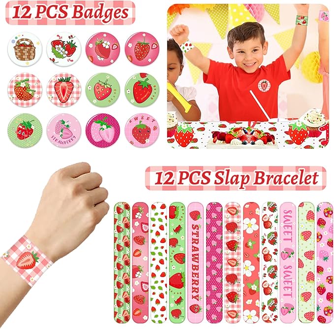 - Strawberry Theme Party Favors: Berry first birthday party supplies contains 12 slap Bracelets, 12bags, 12 badge, 12 Key chains, 50 Stickers and 12 sheet temporary tattoos, has a unique design with strawberry, sweet strawberry, cute, milk strawberry, various strawberry and other sweet styles patterns will make your party very memorable