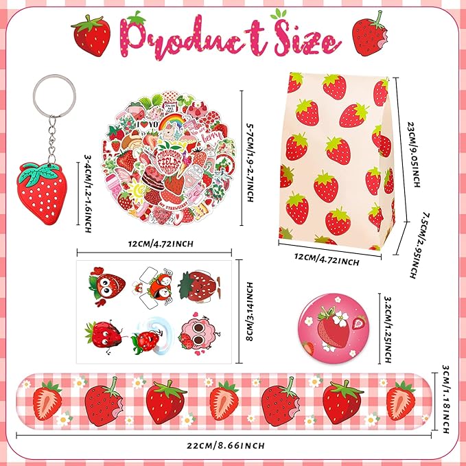 - Lovely and Cute Strawberry Theme: Strawberry themed party decorations gift is mae of high-quality and friendly materials, badge, slap bracelets adnd key chains are printed in HD with clear patterns and bright colors. which are excellent gifts for children, friends and students. This gift will be a very popular party keepsake