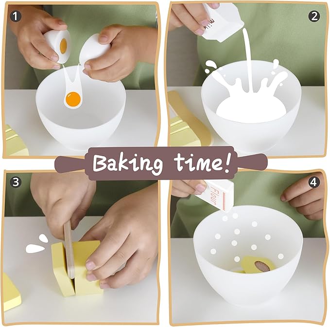 - WOODEN KITCHEN TOYS - All perfectly sized for little hands to hold, little bakers can develop hand-eye coordination and fine motor skills while they pretend to bake. It's a great addition to any playroom and a great toy for developing interest and socializing with kids.
