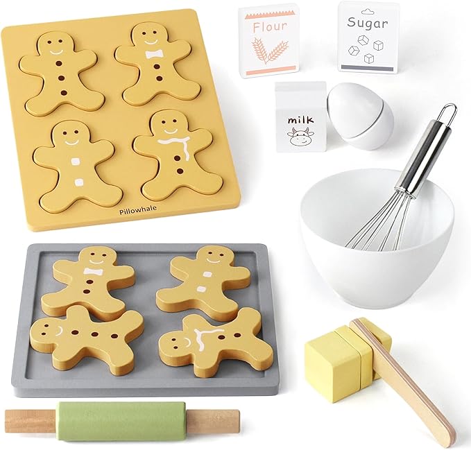 - KIDS PLAY KITCHEN - 18 pieces, accessories for this pretend play food set include sliceable gingerbread man cookies, cookie sheet, whisk, mixing bowl, cookie cutter, rolling pin, eggs, sugar bag, flour bag, milk, butter.