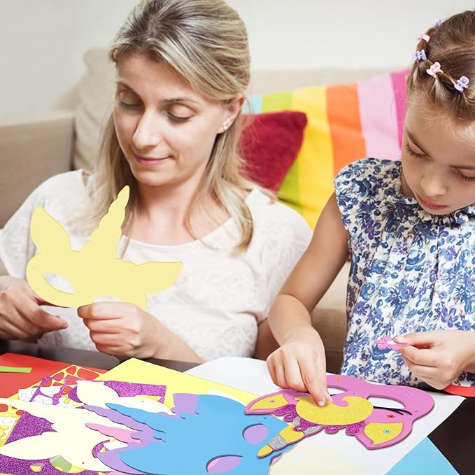 - High Quality Material:Our unicorns mask craft for kids is made of premium EVA foam material. It can be pasted and peeled off multiple times, which is soft and lightweight, safe and environmentally friendly, harmless to children,also it can easily peel off and stick, so children can change the design according to their ideas, let their creativity run wild!