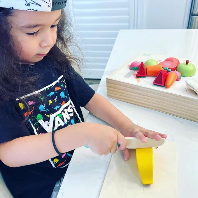 - CREATIVE CUTTING FOOD SET: Preparing a well-balanced meal is child’s play with this 12-piece food play set! Featuring solid wooden foods in 5 all food groups, a wooden cutting board, and a kid-safe wooden knife, this set is perfect for healthy pretend play!