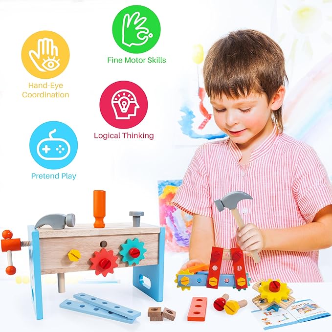 - đ§ăSTEM MONTESSORI TOYSăAs kids twist screws, hammer nails, saw sheets, and manipulate gears, the tool box play set provides a chance to improve their hands-on ability, develop hand-eye coordination and fine motor skills, encourage imagination and creativity, and boost logical thinking.