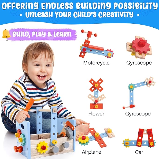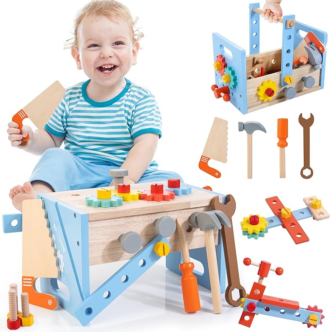 - đ¨ă3-IN-1 WOODEN TOOL SETăThis toddler tool kit can be transformed to make a tool bench, storage box, or carrying box that toddlers can pretend play pounding, twisting, sawing, etc., or learn to tidy up the toys into the box to keep it neat, or even take along to enjoy the building fun wherever they go.