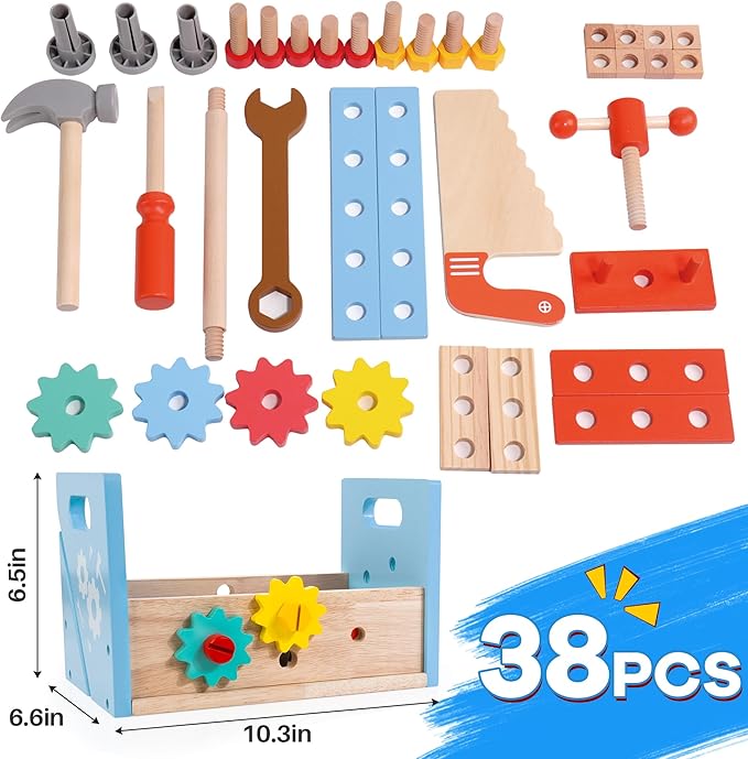 • 🎁【38PCS VALUE PACK GIFT】Containing 38 pieces of various tools and accessories, this value-packed wooden toolbox playset makes a wonderful gift for enthusiastic little builders on birthday, Christmas, and other festivals.