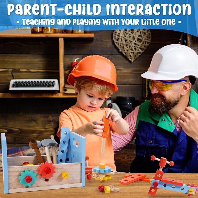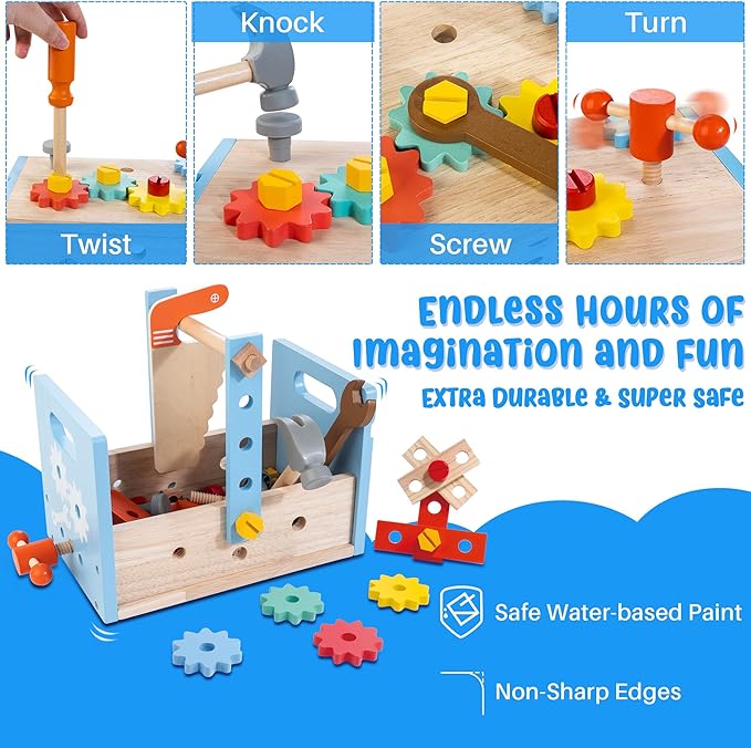 • 🚀 【CHILD FRIENDLY】The tool set is made of durable wood and covered with non-toxic finishes. It is polished with smooth surfaces and round edges, sized for little hands to easily grasp. The solid structure ensures safe and long screen-free fun.