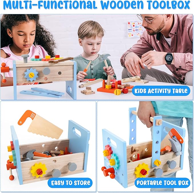 • 🔨【3-IN-1 WOODEN TOOL SET】This toddler tool kit can be transformed to make a tool bench, storage box, or carrying box that toddlers can pretend play pounding, twisting, sawing, etc., or learn to tidy up the toys into the box to keep it neat, or even take along to enjoy the building fun wherever they go.