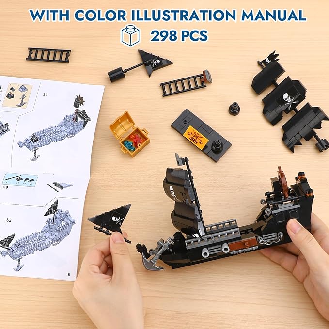 - Clear Building Steps - The black pirate ship building set consists of 298 pieces, include full-color instruction manual. It’s easy for children to build a ship model by following the clear steps. Providing endless fun in construction and play