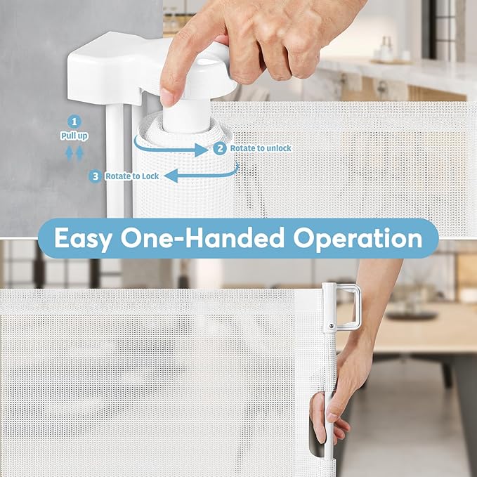 - Easy One-Handed Operation: Our retractable dog gate has a one-handed locking and unlocking mechanism. Once locked, the retractable fence securely closes to prevent accidental opening by babies and pets.