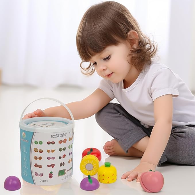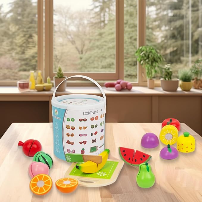 Wooden Play Food for Kids Kitchen, 38PCS Cutting Fruits Toys for Toddlers Pretend Vegetables Gift for Boys Girls Educational Toys (Fruit Bucket)