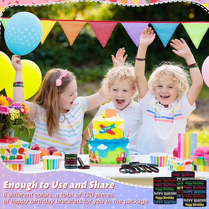 Sratte 120 Pcs Happy Birthday Rubber Bracelets for Kids Stretch Wristbands Bulk Birthday Bracelets for Classroom Student Back to School Gift Teacher Birthday Party Favors Supplies