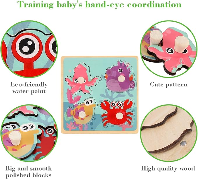 - Fun and Educational: Our kids' puzzle is designed with amusing illustrations and vibrant colors that are sure to captivate your baby's attention and promote enjoyable playtime! Moreover, these wooden puzzles play a crucial role in supporting normal development by stimulating attention, enhancing dexterity, improving hand-eye coordination, and providing visual and sensory stimulation.
