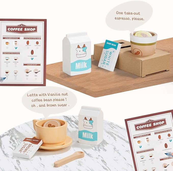 - 【Learning and ability building in Play】: The Giant Bean wooden coffee maker set promote younge children's early development and ability building by enhancing their motor skills,hand-eye coordination, creativity and imagination; The coffee shop play mode can strengthen children's expression, logical thinking, social skills and better prepare them for school life and society