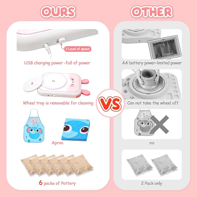 - ALL-INCLUSIVE SET: With our pottery wheel kit for kids age 9-12, you'll receive everything your child needs to get started on their artistic journey. The set includes 1 pottery wheel kit, 6 air dry clays, 1 refillable spray bottle, 2 painting brushes, 2 painting kits, 1 painting tray, 1 transite cording, 1 USB charging cable, 1 non-slip sponge sticker, 1 gem sticker, 1 apron, and 2 clay knife & shaping tools.