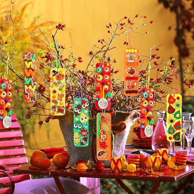 - 【What Will You Receive】You will receive 880 Thanksgiving foam bookmarks craft DIY kit, Including 36 colorful foam blank bookmarks, 150 colorful self-adhesive foam stickers of Thanksgiving design, 150 glitter leaves self-adhesive foam stickers in heart shape, 200 pom-poms, 1 sheet rhinestone sticker, 36pcs pipe cleaners,100 googly eyes,100pcs double-sided sticky dots, 36 root of satin cords, enough to meet your creative needs