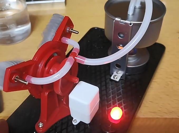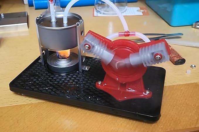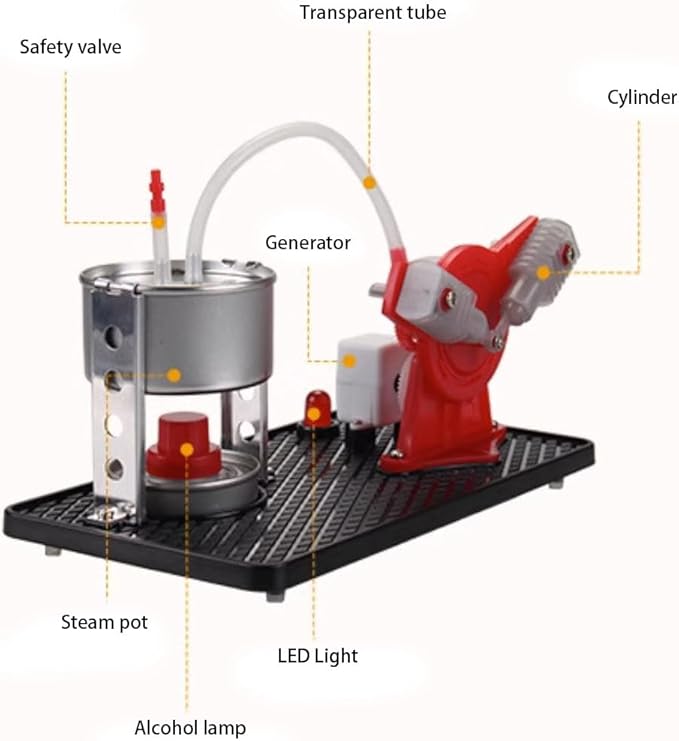 - This model converts thermal energy into electrical and mechanical energy, making it an ideal tool for science experiments, STEM education It utilizes the heat from an alcohol lamp to heat water in a sealed chamber. The water is heated and vaporizes into steam and generates pressure to drive the piston, The piston moves back and forth, driving the generator through a gear mechanism to generate electricity to power the led light onboard. This experiment helps to understand the basic principles and applications of steam engines.