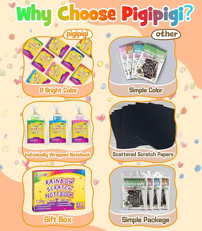 - šCOST-EFFECTIVE SET: Pigipigi scratch paper craft kit includes 16 colorful mini notebook (5.5 Ć 4.0 inches), 18 wooden styluses, 16 drawing stencils, 18 golden ribbons, 18 clear plastic bags and 1 gift box. The black scratch paper sheet will keep kids busy for a long time, away from electronic devices, and give full play to their creativity. Perfect for any occasion, these diy scratch art are the great gift for girls and boys ages 3 4 5 6 7 8 9 10 11 12