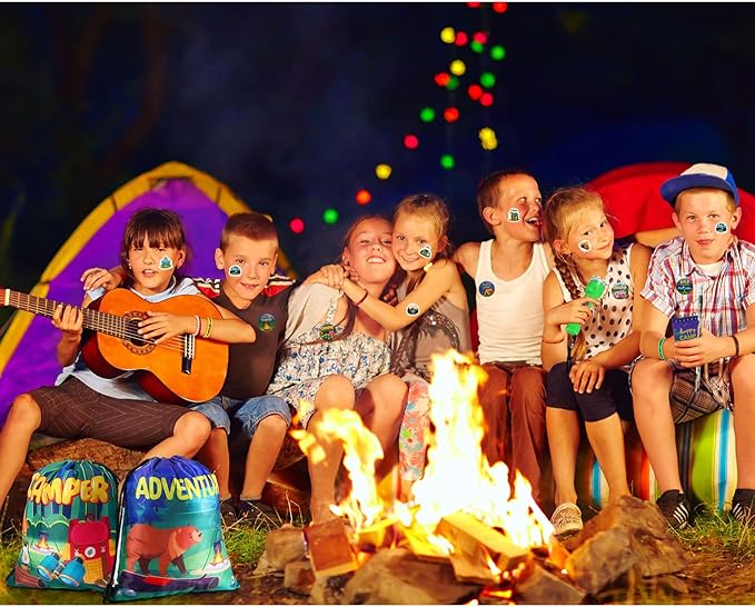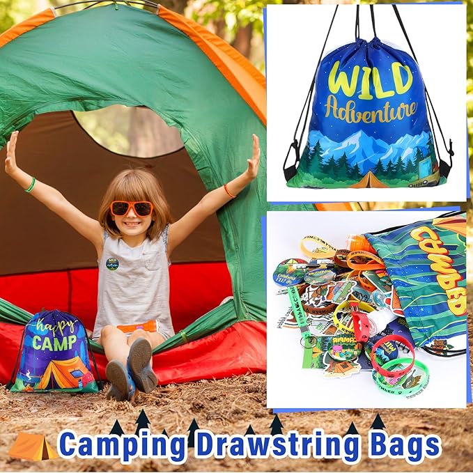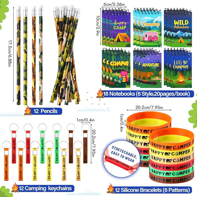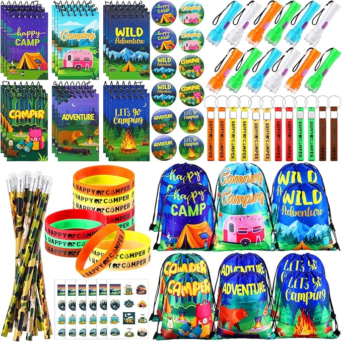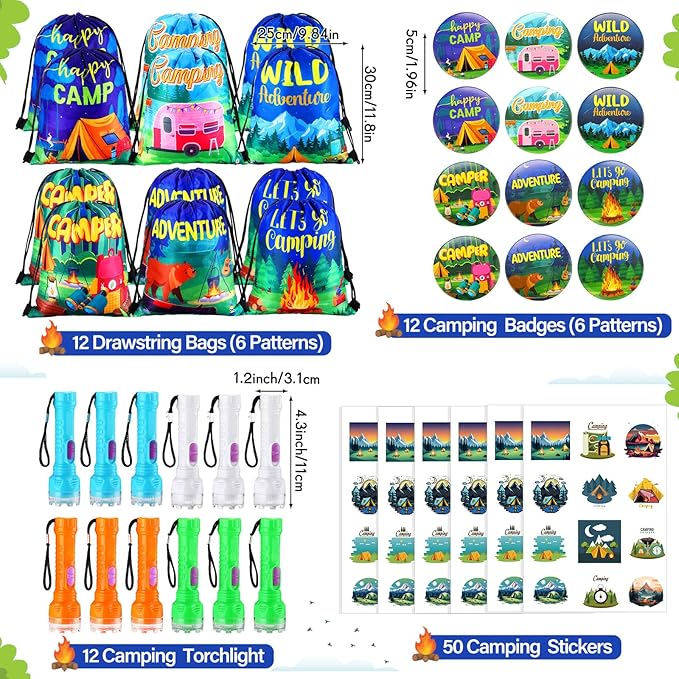 - Quantity for a Memorable Camping Party: with the package containing 12 drawstring bags, 18 spiral notebooks, 12 silicone bracelets, 12 badges, 12 keychains, 12 mini flashlights, 50 sheets of stickers, and 12 pencils, our camping birthday party supplies ensure that every attendee will have their own exciting and functional keepsake to treasure