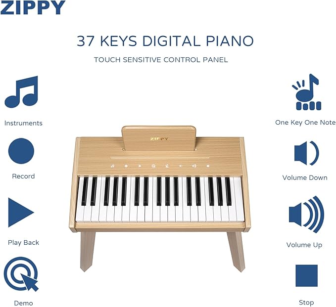 • 【MULTIPLE PLAYABILITY】This newly hand-crafted ZIPPY piano is equipped with a touch sensitive control panel which includes multiple functions like instruments change, built-in songs demostration, record, play back and one key one note for beginners. It is also upgraded to a volume adjustable version.