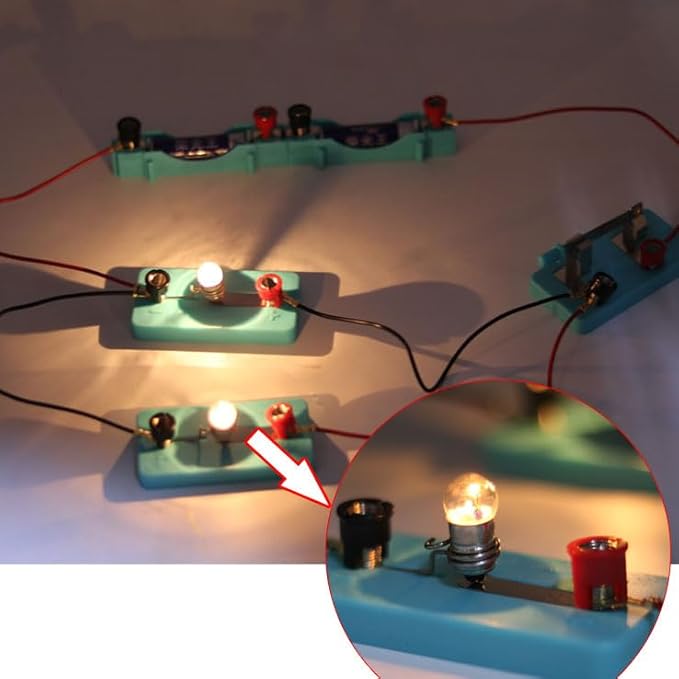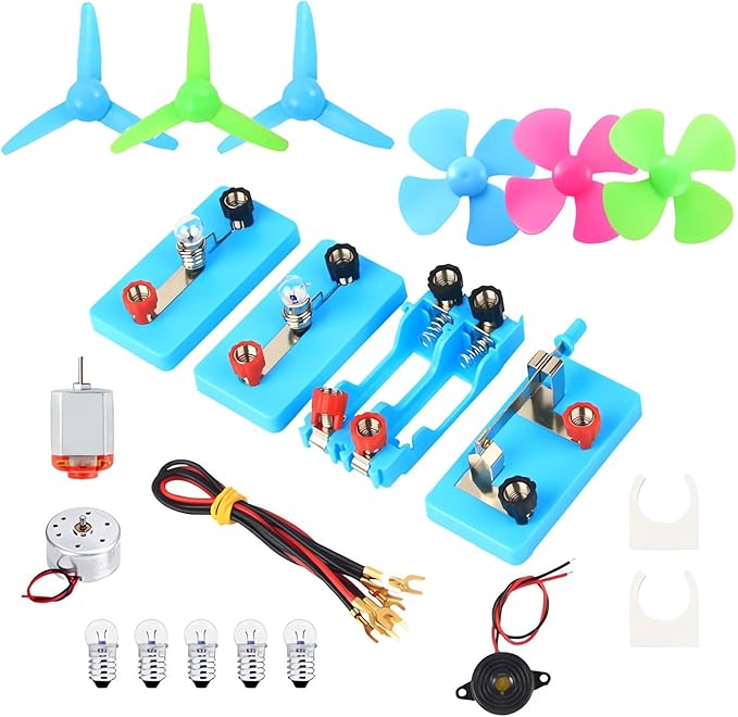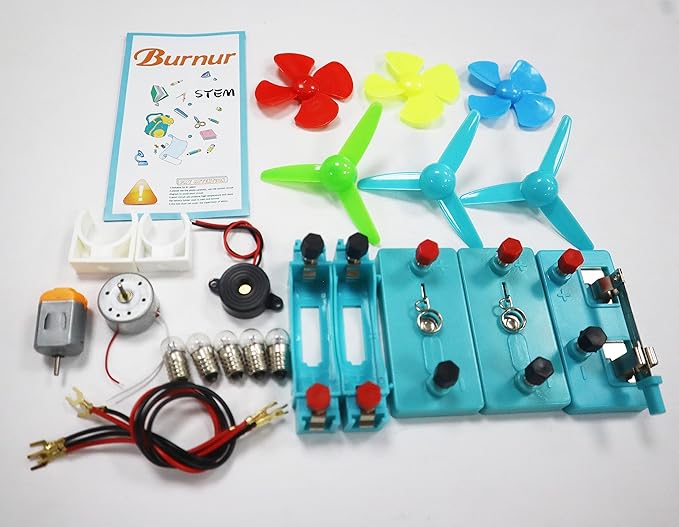 - COMPLETE CIRCUIT KIT: Comes with one instructions, 5 x lead wires, 5 x bulbs, 2 x motors, 2 x motor holder, 1 x Switch, 3 x propeller with 3 Vanes, 3 x propeller with 4 Vanes, 1 x buzzer sounder, 2 x bulb holders, 2 x AA size battery holder (1 x 1.5V), packaged with enough circuit accessories for you do science experiments project easily.
