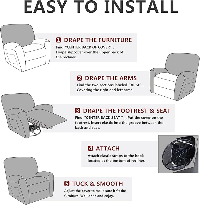 - NON SLIP: Effortless for installation (guide photos in the package), 4-piece includes for up back, right and left arms, the footrest, easy for washing separately.Sewn with thick elastic loops to cover the bottom edges,Recliner Sofa Cover is fitted well even with dogs jumping on it.High recommended for both leather and cloth sofa.