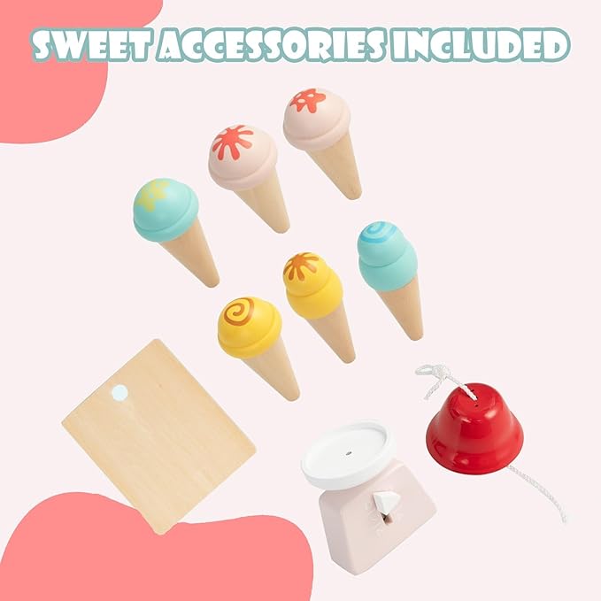 • 🍩【Complete Market Setup】: The vibrant wooden farmer market playset comes with six pretend ice cream toys, food scales, chalkboards, and a charming ring bell. The ample storage space can hold other play kitchen accessories, and the chalkboard can be used to write product names or prices.