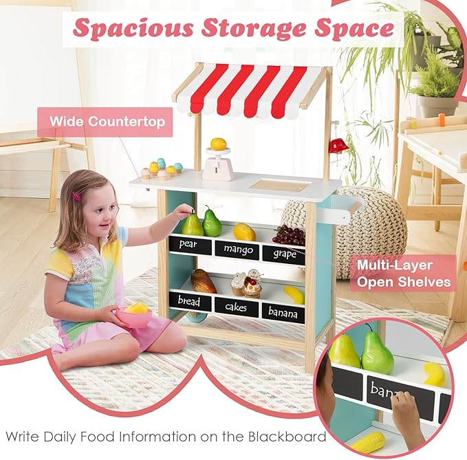 • 🎁【Ideal Gift for Kids】: This classic-looking wooden market stall with its stylish striped canopy is sure to capture the attention of kids. It's a perfect present for any child over 3 years old, whether for a birthday or holiday celebration.