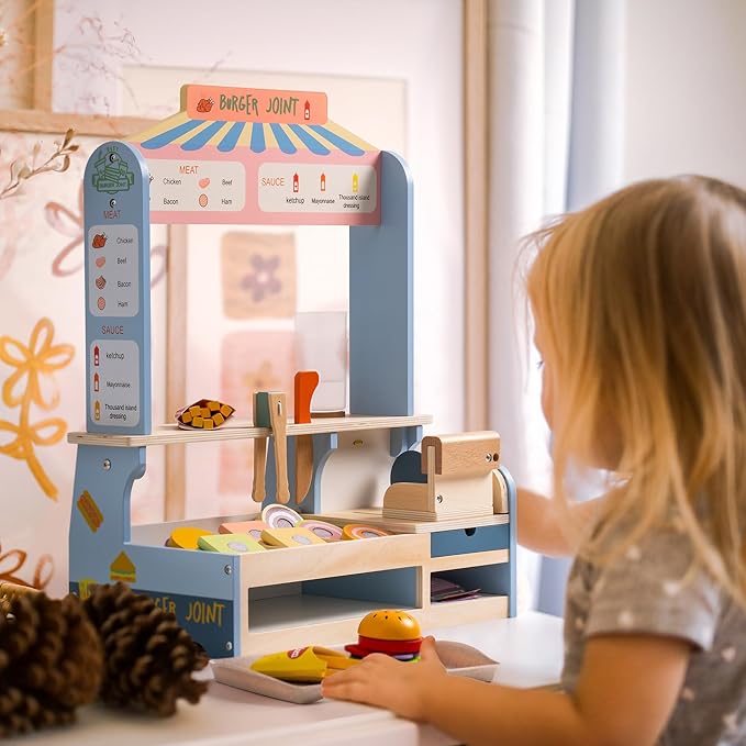 - Interactive Features: The interactive slicer allows kids to slice wooden meat and cheese pieces, enhancing their sensory experience. The rotating drink dispenser and menu board add to the authenticity and excitement.