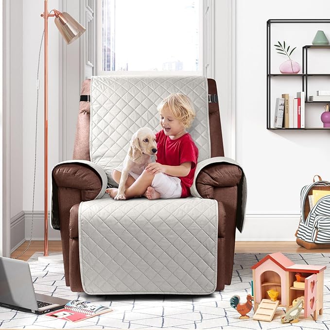 KinCam 100% Waterproof Recliner Chair Cover, Reclining Couch Covers for Pets, Dogs, Recliner Couch Slipcover Furniture Protector with Elastic Straps for Kids(23.6", Beige White)