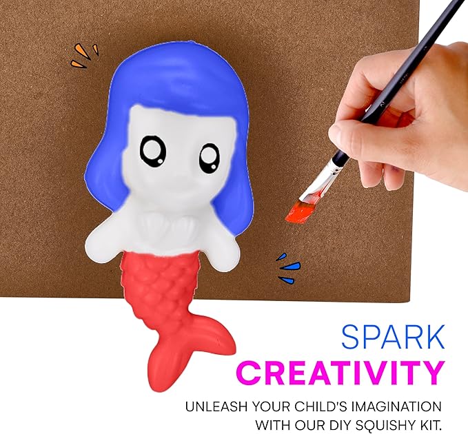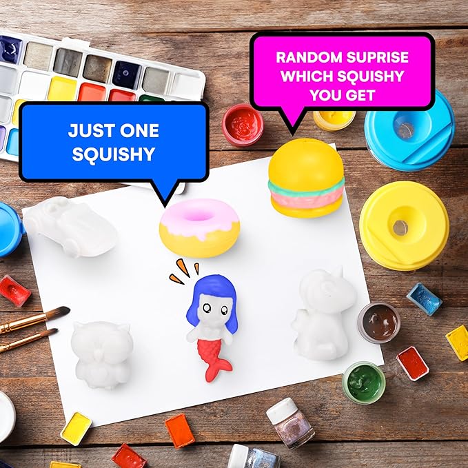 - SUPRISE EFFECT: This comes with ONE RANDOM SQUISHY, 1 brush and 1 paint rack, allowing children to design and paint squishies, offering hours of creative fun with ONE DIY squishy