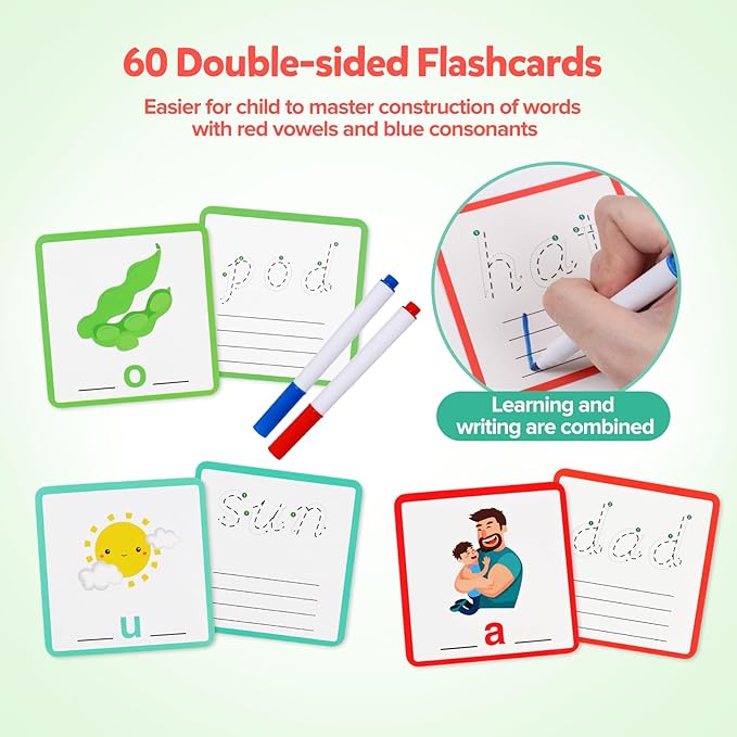 - CVC Word Games: Package includes 60 double-sided CVC phonics flash cards (a side is the word, and the another side is picture), 78 wooden lowercase letter blocks (15 colored vowels and 63 pcs blue consonants), 5 wooden spell boards in palm-size, 2 dry-erase markers that are wipable for repeated use, and 1 Wiping cloth. The package also comes with a draw-string portable bag for easy storage.