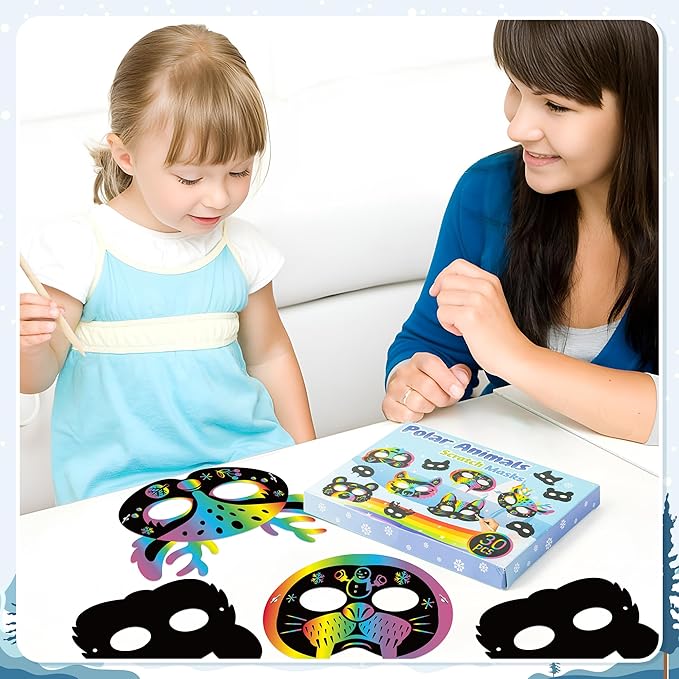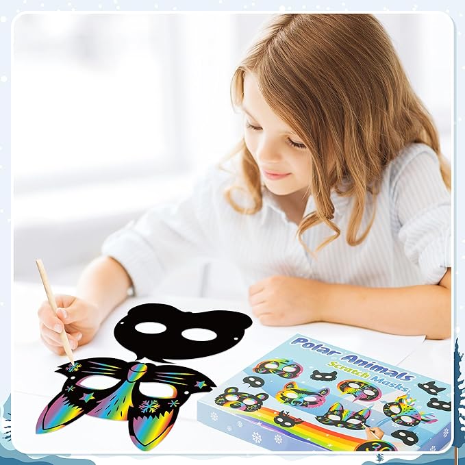 B1ykin 30Pcs Polar Animals Scratch Mask Gift Set, DIY Magic Winter Arctic Animal Scratch Masks Craft Kit for Kids, Color Paper Party Favors for Birthday School Classroom Art Activity Project