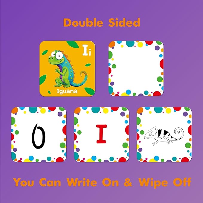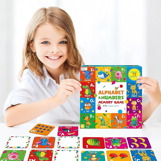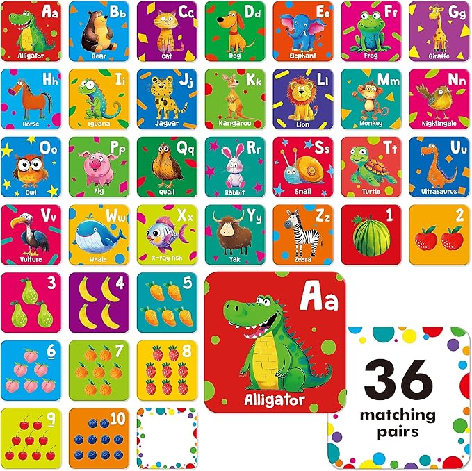 - Including 72 PCS MATCHING CARDS: Total 72 cards make it 36 pairs for kids to get familiar with alphabet and number knowledge. Double-sided design makes you have different ways to play. One side printed with vibrant patterns, another side is blank, you can draw pictures you want on it and make a new game by your imagination. Each card measures 2” X 2”.