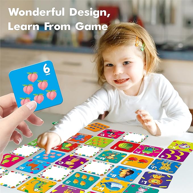 - THE FUNNIEST THEME: The set contains uppercase, lowercase letters, cute animals, numbers and fruits. It is lively and full of happiness, which will grab children’s interest greatly and get their attention focused. Challenge toddlers’ problem solving and develop memory skills. Kids will get excited when they find the match themselves and it’s always fun to see who has the most matches.