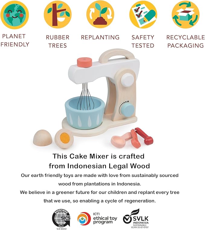 Mentari Toys - Cake Mixer - 7pc Wooden Baking Play Set - Pretend Play Kitchen Accessory with Bowl, Rotating Whisk, Egg and Measuring Spoons - Encourages Role Play and Fine Motor Skills - Age 3+