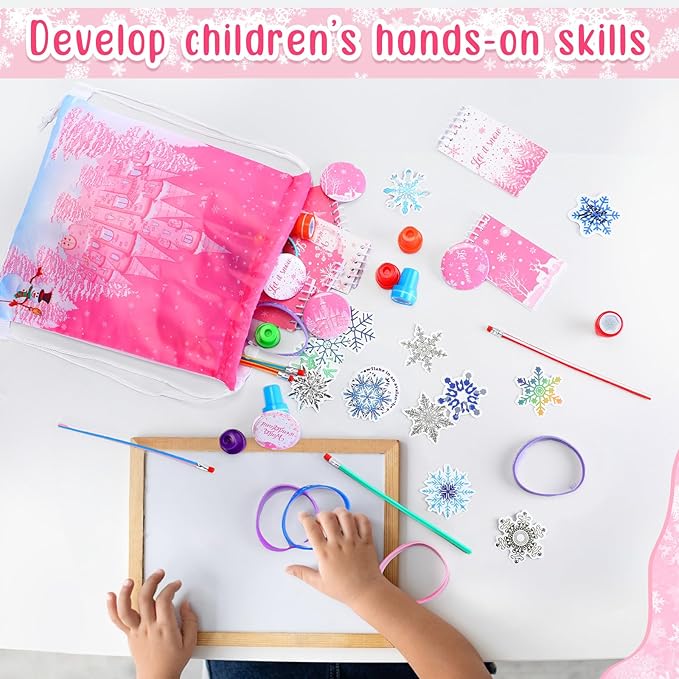 Abbylike 140 Pcs Winter Party Favors Christmas Gifts for Kids Snowflake Wonderland Party Favors Supplies Birthday Notebook Bracelet Stamper Sticker Drawstring Bag Pencil Button Pin Keychain